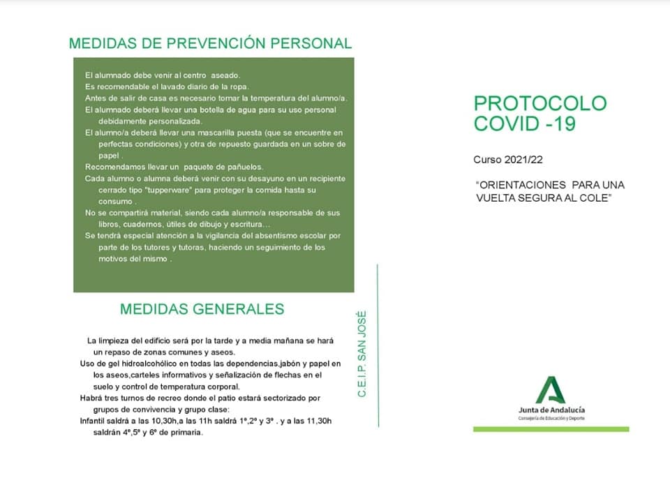 Medidas generales a seguir teniendo en cuenta el protocolo COVID. Rogamos la colaboración de todas las familias para el buen desarrollo del curso escolar, como así fue en el pasado curso. Gracias.